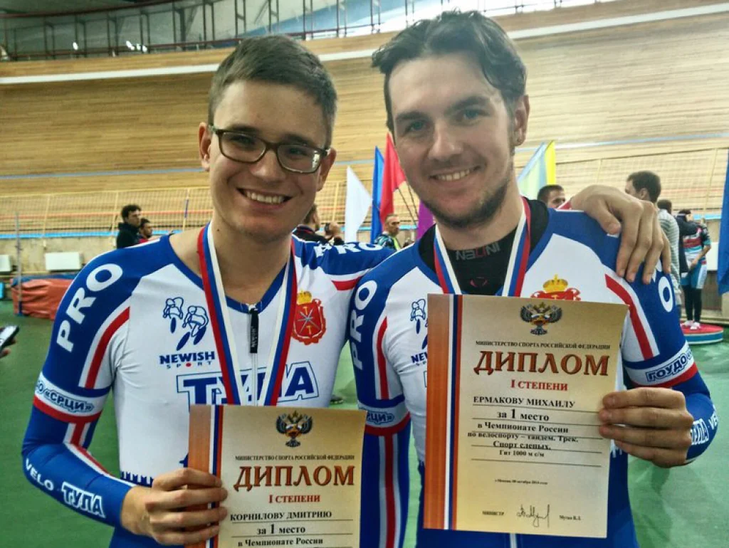 На прошедшем в Москве Чемпионате России по велоспорту на треке среди спортсменов с нарушением зрения туляк Дмитрий Корнилов и его пилот Михаил Ермаков. Молодые люди установили два рекорда России. Тандем завоевал золотые медали в гите на 1000 метров и гонке преследования на 4000 метров.