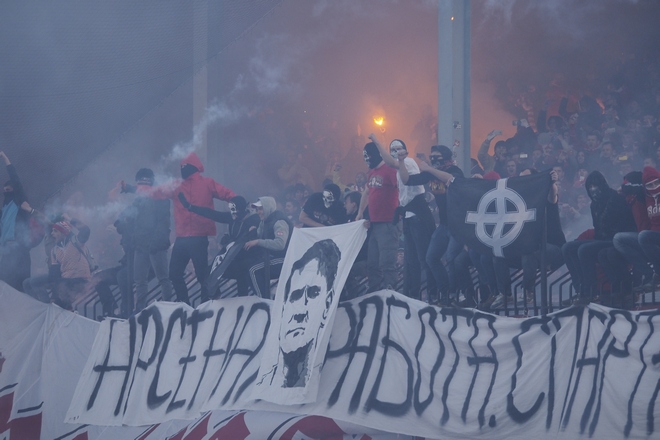 (во время матча фанаты "Спартака" выбрались на крышу).