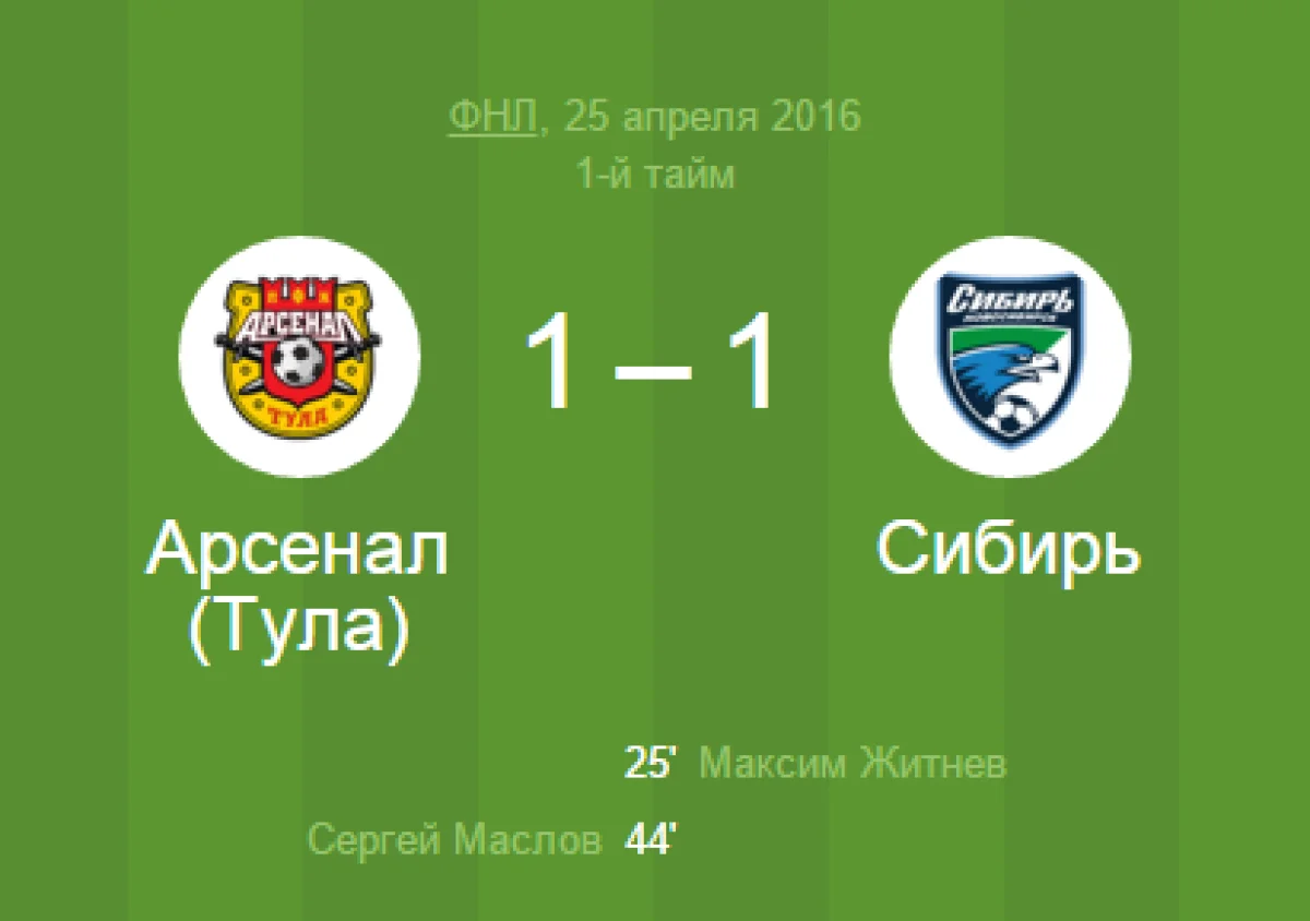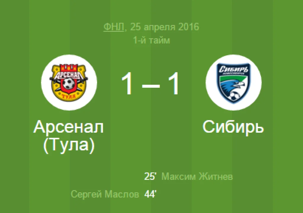 Тульский «Арсенал» упорно борется на поле с новосибирской «Сибирью». С начала первого тайма у канониров игра не задалась: гости забили с пенальти - 1:0. Но под конец матча Сергей Маслов отправил мяч в «раздевалку» и сравнял счет. Это 10-й мяч Маслова за тульский клуб.