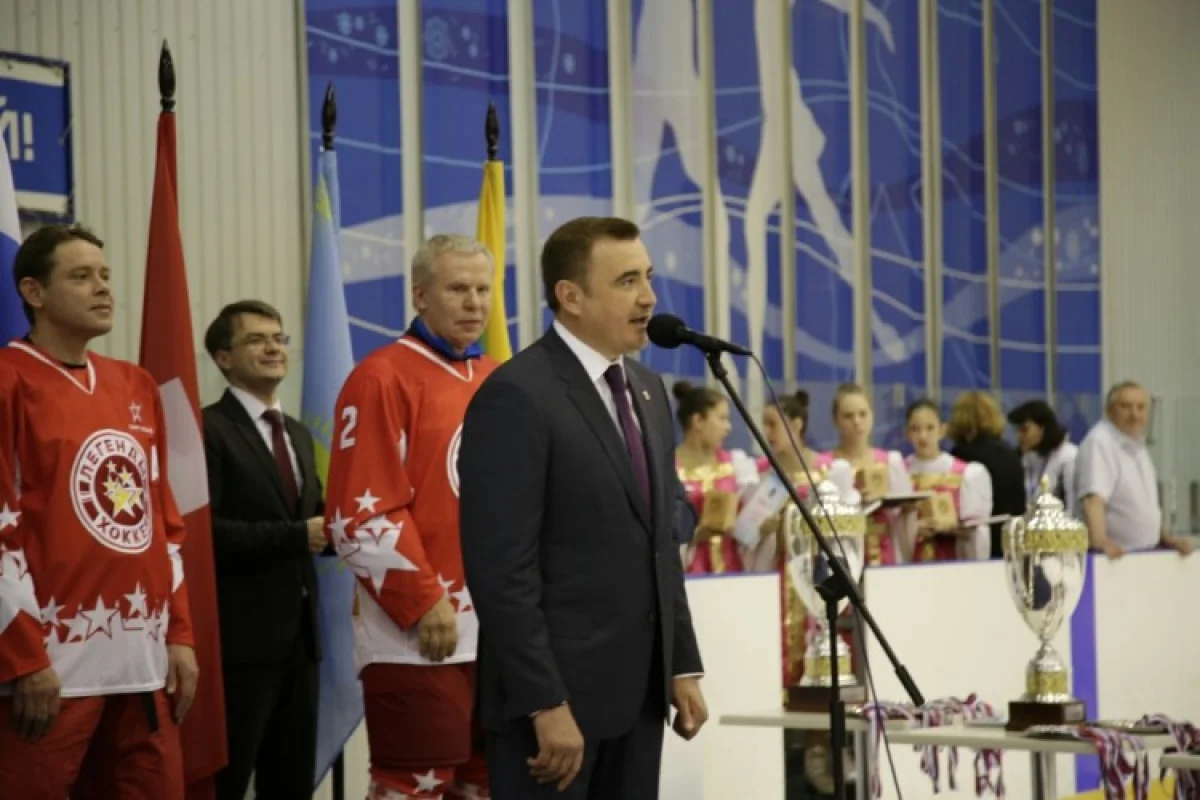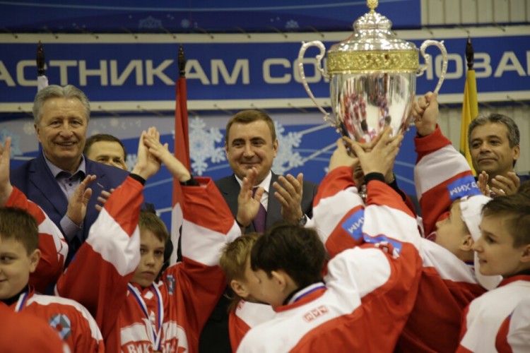 Юных спортсменов и прославленных хоккеистов приветствовал Алексей Дюмин. Он поздравил новомосковскую команду «Виктория», которая заняла в турнире первое место.