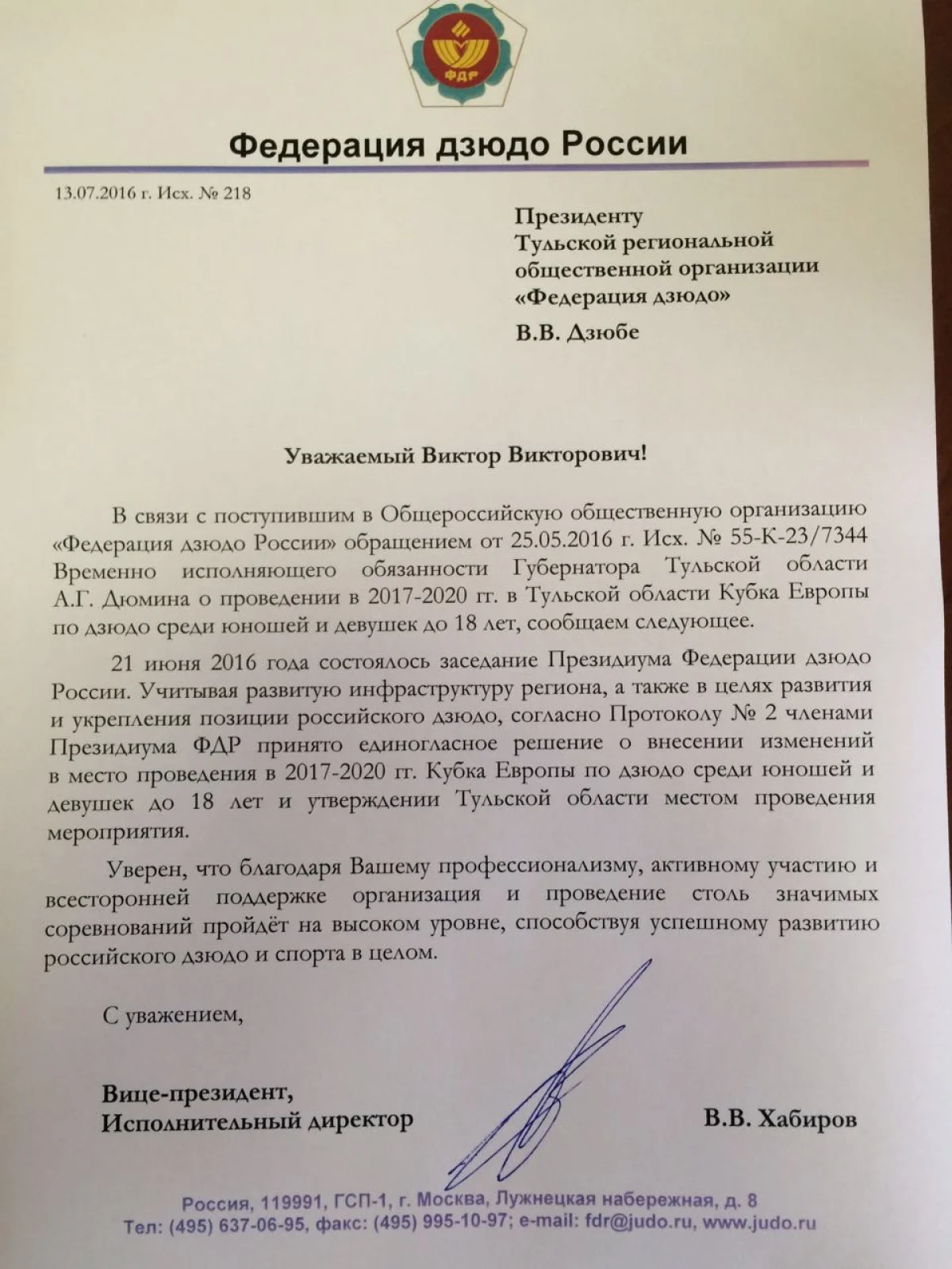 13 июля Президент Тульской региональной общественной организации «Федерация дзюдо» Виктор Дзюба получил письмо вице-президента Федерации дзюдо России Валентина Хабирова, в котором говорится о внесении изменений в место проведения в 2017-2020 годах Кубка Европы по дзюдо среди юношей и девушек до 18 лет и утверждении Тульской области местом проведения мероприятия.