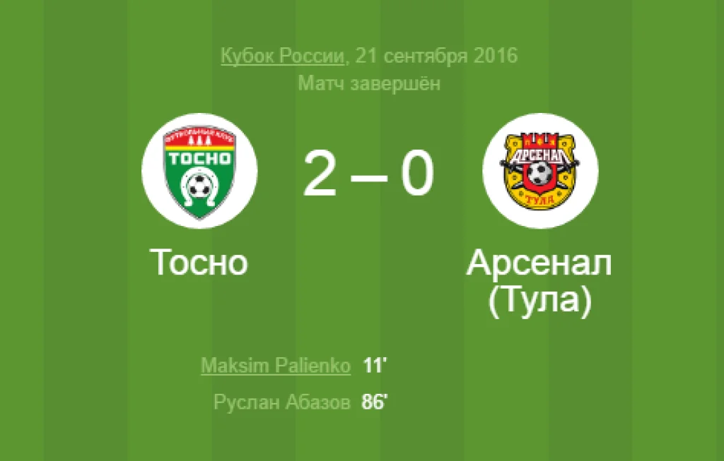 В матче 1/16 финала Кубка России клуб «Тосно» из Ленинградской области обыграл туляков со счетом