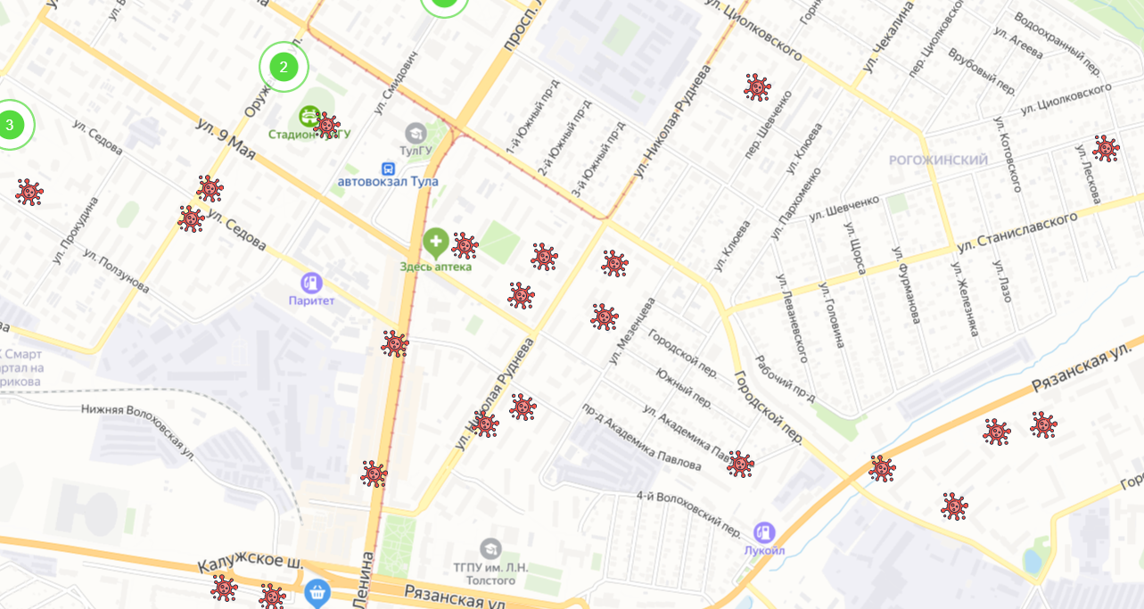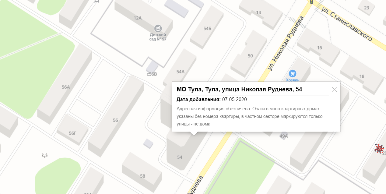 Такая карта предоставляет статистику активных очагов заболевания, однако, сохраняя конфиденциальность, не указывая номера квартир. На карте отмечается “кляксой” только адрес без уточнения количества заразившихся коронавирусом человек. Тем самым в одном доме может быть от одного до десятка случаев заражения. Однако, даже такая информация поможет тулякам более аккуратно передвигаться по городу и различным зданиям и домам, зная,, где их ожидает опасность.
