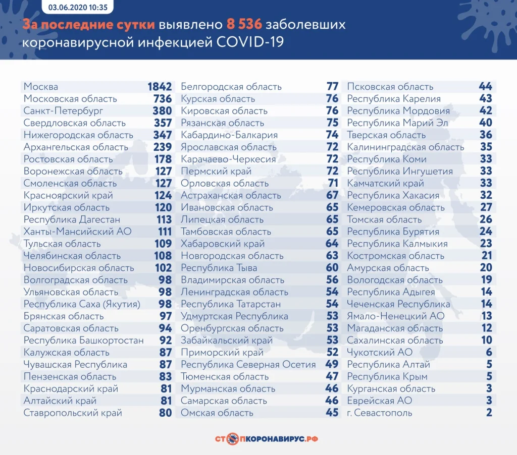 В лидерах по числу инфицированных в стране оказались Санкт-Петербург (380), Московская область (736) и Москва (1842).
