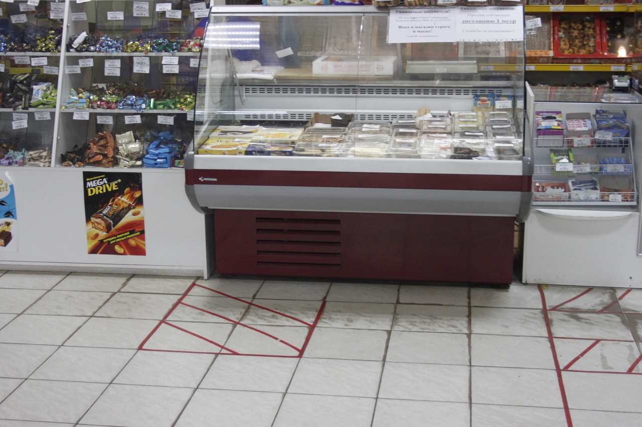 В помещении еще не успели все приспособить к новым требованиям: как раз перед нашим приходом продавцы начали наносить разметку. До этого магазин был закрыт с самого начала эпидемии. Однако все требования безукоризненно соблюдают, полы моют каждые два часа, после каждого покупателя дезинфицируют руки.