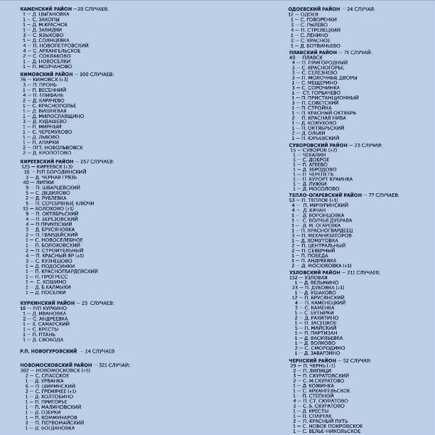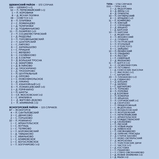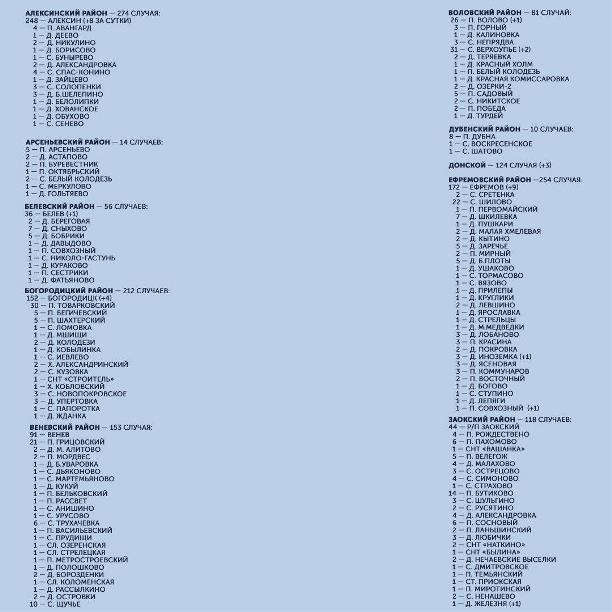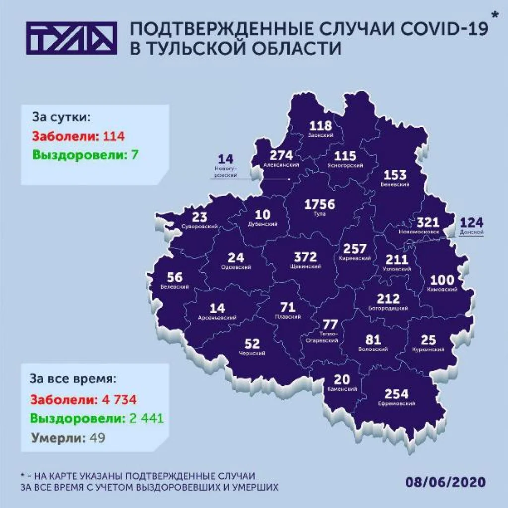 8 июня в Тульской области зафиксированы 114 новых случаев заражения коронавирусом. Инфекцию обнаружили у жителей Тулы, Донского, Алексинского, Белевского, Богородицкого, Воловского, Ефремовского, Заокского, Кимовского, Киреевского, Новомосковского, Суворовского, Тепло-Огаревского, Узловского, Чернского, Щекинского и Ясногорского районов.