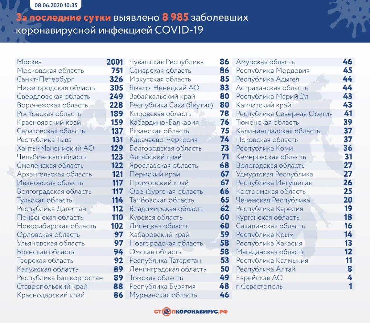 В лидерах по числу заболевших в России оказались: Санкт-Петербург (326), Московская область (751) и Москва (2001).