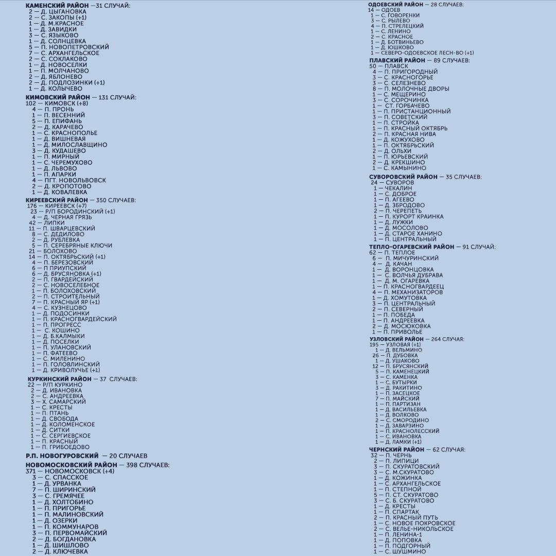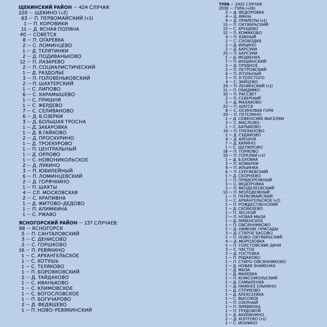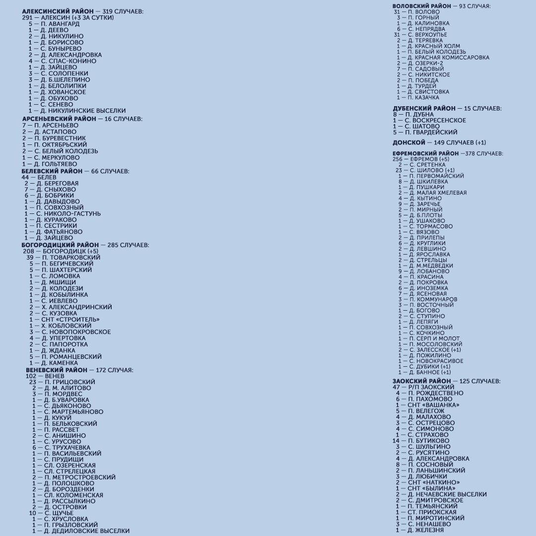 23 июня в Тульской области зафиксировано 81 новых случаев заражения коронавирусом. Инфекцию обнаружили у жителей Тулы, Донского, Алексинского, Богородицкого, Ефремовского, Каменского, Кимовского, Киреевского, Новомосковского, Одоевского, Узловского и Щекинского районов.