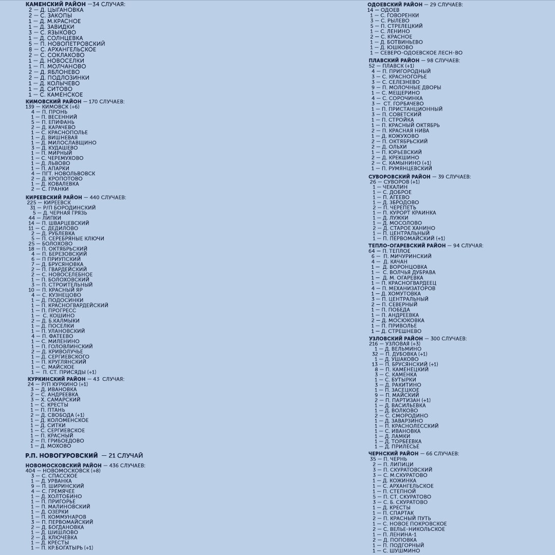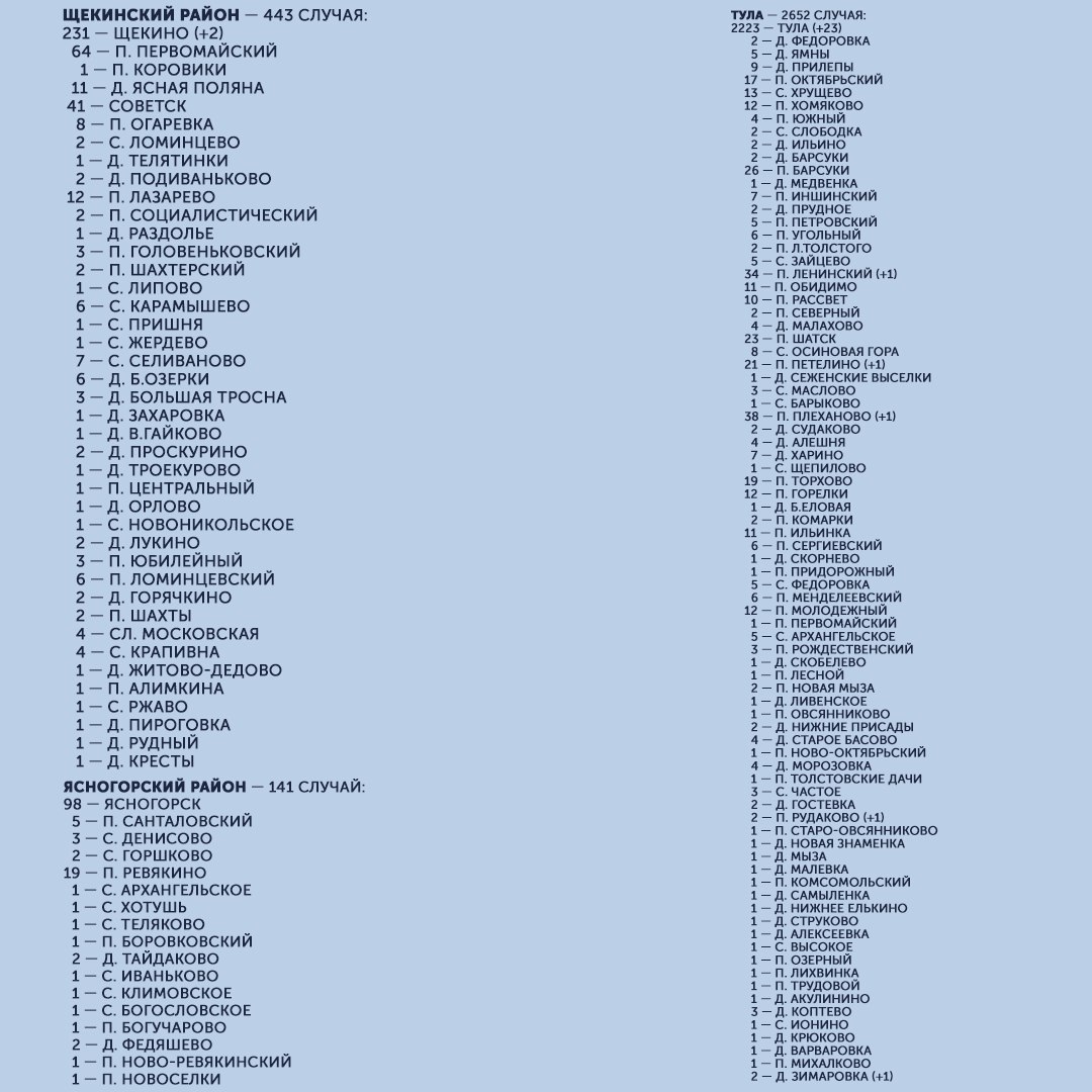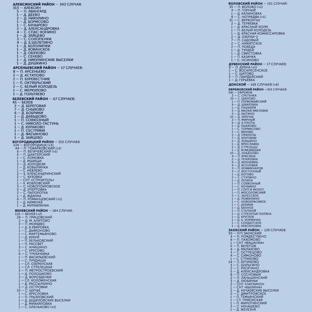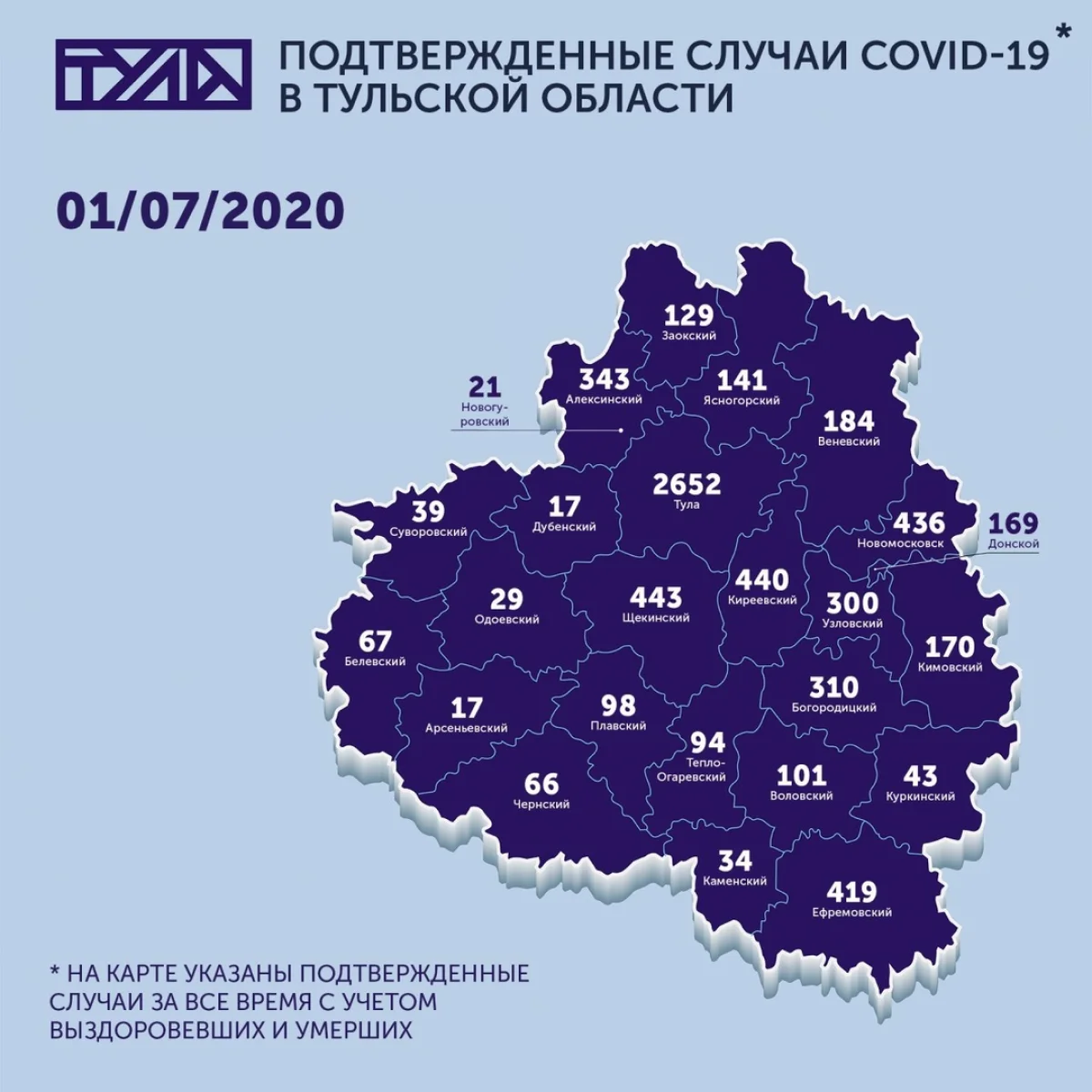 1 июля в Тульской области зафиксировано 76 новых случаев заражения коронавирусом. Инфекцию обнаружили у жителей Тулы, Донского, Богородицкого, Веневского, Воловского, Дубенского, Кимовского, Киреевского, Куркинского, Новомосковского, Плавского, Суворовского, Узловского и Щекинского районов.