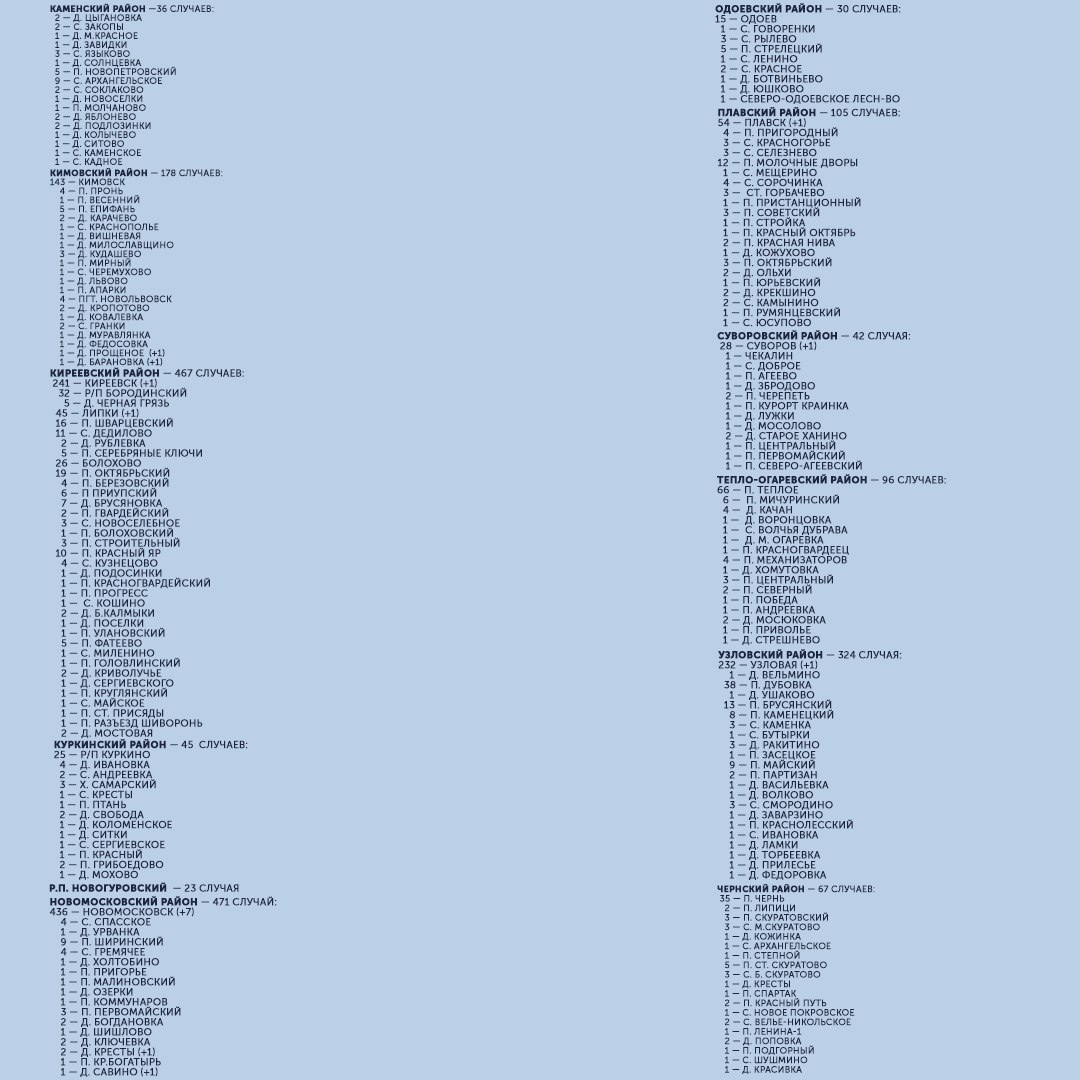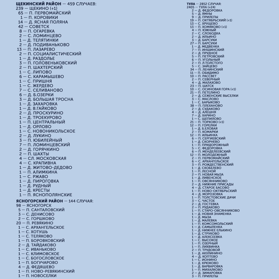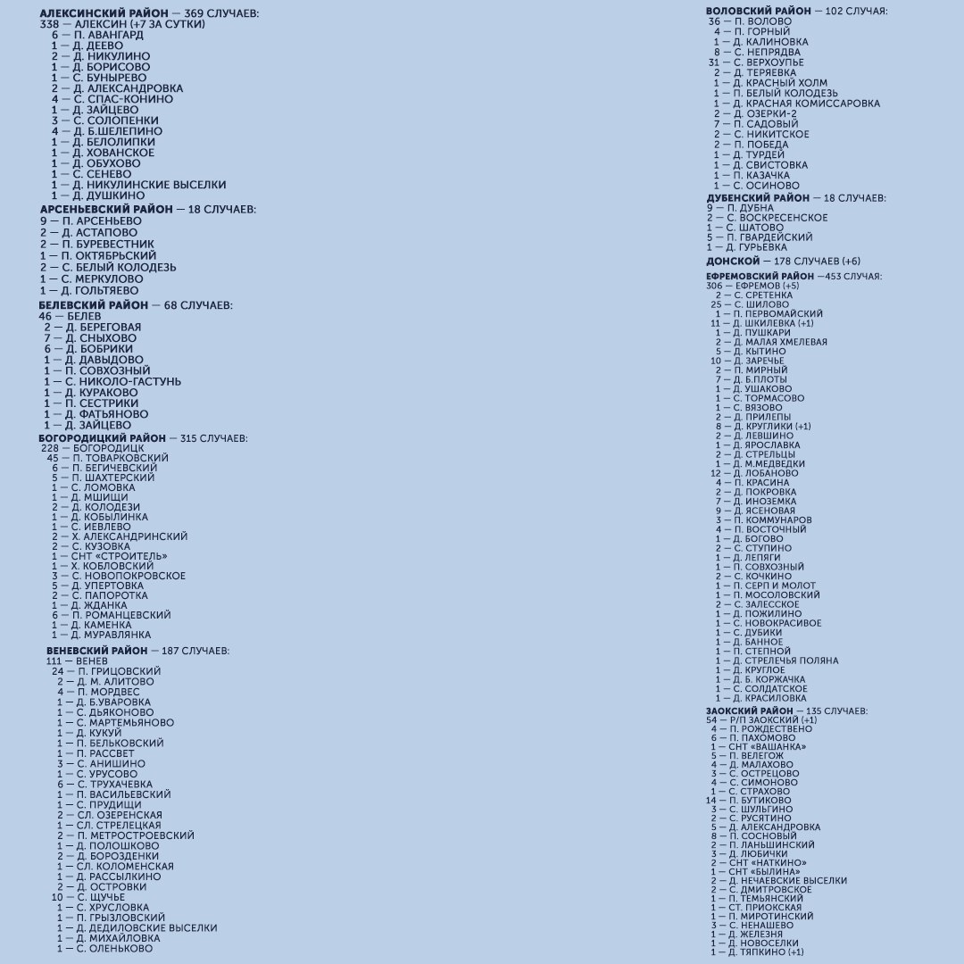 7 июля в Тульской области зафиксировано 67 новых случаев заражения коронавирусом. Инфекцию обнаружили у жителей Тулы, Донского, Алексинского, Ефремовского, Заокского, Кимовского, Киреевского, Новомосковского, Плавского, Суворовского, Узловского и Щекинского районов.