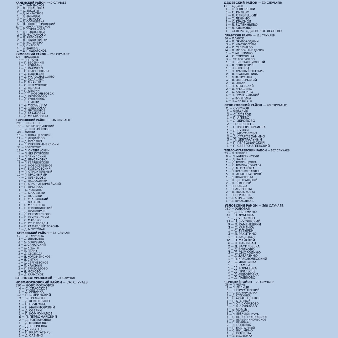В Туле опубликовали карту распространения коронавируса по районам области. Напомним, если раньше статистика была доступна каждый день, то теперь ее можно будет видеть лишь раз в неделю.