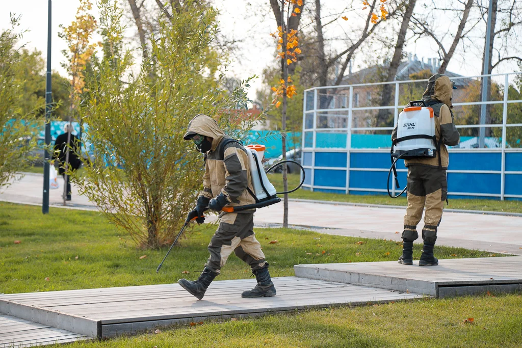 Дважды в неделю дезинфицируют подземные переходы. Ведется и санобработка многоквартирных домов, подъездов, придомовых территорий, детских и спортивных площадок. Ей занимаются УК, поисково-спасательная служба Центра гражданской защиты и спасательных работ, городская ветеринарная служба по борьбе с болезнями животных.