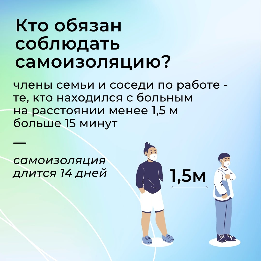 Министерство здравоохранения Тульской области опубликовало карточки с наглядным разъяснением правил самоизоляции, если вы контактировали с больным коронавирусом. Так, на двухнедельный карантин придется уйти тому, кто находился рядом с больным ближе 1,5 метров и дольше 15 минут.