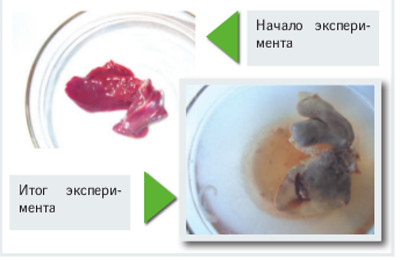 эксперимента газировка стала темно-желтого цвета, а печень вся в язвах и пятнах, уменьшилась в размерах. На дне