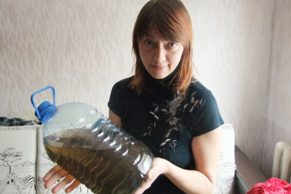 - Эта черная вода стоит в бутылке 2 суток, сейчас выпал осадок, - рассказывает жительница поселка Рассвет, дома 55 Елена Конькова, демонстрируя бутылку с черной водой. - Когда здесь заправляются пожарные машины, в кране нет никакой воды, а как только они уезжают — грязь, ржаво-черная вода, приходится сливать несколько часов. Вчера я звонила в нашу управляющую компанию, они мне сказали, что не могут запретить пожарным машинам заправляться. Если такая вода попала в стиральную машинку — белье становится черным, а сама машинка может и сломаться. Я на одну еле наскребла, и если с ней что-то случится, то и не знаю, что мне делать. Один раз я мыла голову, намылила, а воды нет, смотрю, машины пожарные заправляются. Знаю, что и с нашего дома поступали жалобы, и с 54-ого, и даже с другого конца поселка. Пить такую воду нельзя, мыться в ней нельзя. Эту проблему я ее уже 3 года замечаю. Для питья и в еду используем покупную воду в 5-литровых бутылках. А носить такую тяжесть я не могу, у меня позвоночная грыжа и поднимать груз свыше 3 кг мне нельзя.
