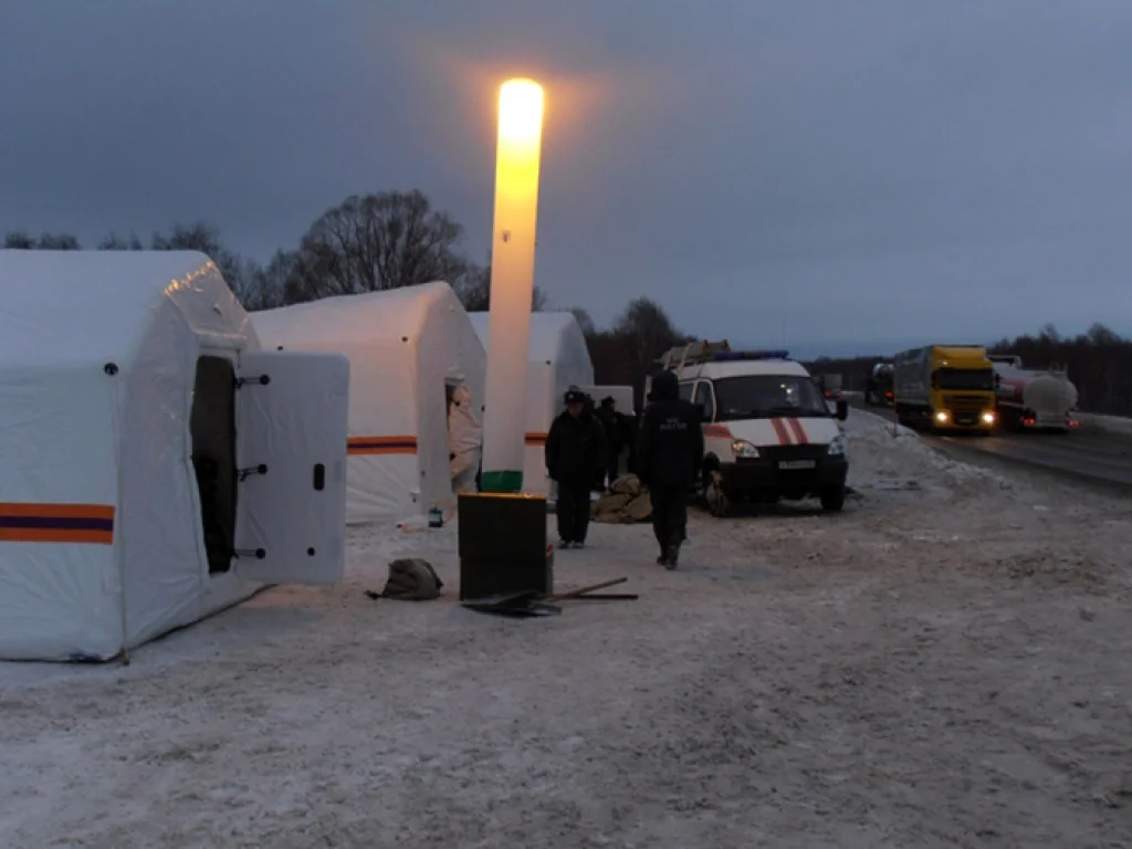 Экипажи пунктов обогрева МЧС на специальных автомобилях, укомплектованных спасательным оборудованием, полевой кухней, палаткой, печью, теплыми вещами и другим необходимым средствами, готовы оказать помощь и обогреть пострадавших.