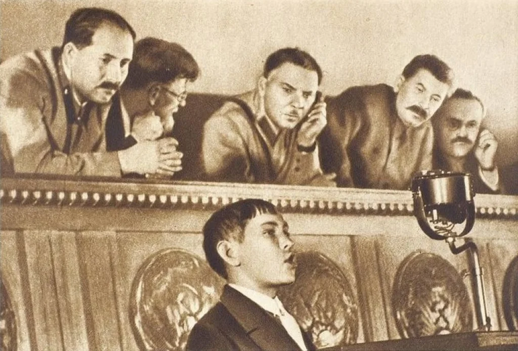 На фото: товарищи Сталин, Молотов, Каганович, Ворошлов, Калинин с большим вниманием слушают речь токаря Куйбышевского карбюраторного завода товарища Курьянова.