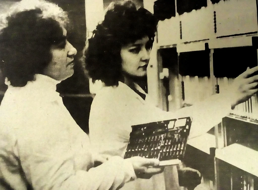 На фото: новую технику осваивают инженер АТС Л. Гаврилова и молодой специалист-электромеханик В. Плейко.