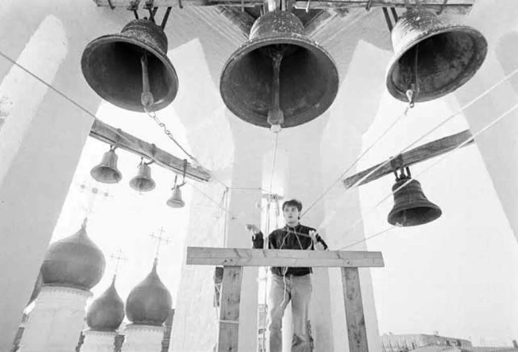 Тогда же, в июне 1990-го, Лев Махно пообещал, что на следующую Пасху в храме зазвонят колокола. Глядя на окружающую разруху, в эти слова, конечно, верили с трудом. Однако 23 марта 1991 года на Благовещенский храм действительно подняли семь колоколов, как здесь и было в старые времена.
