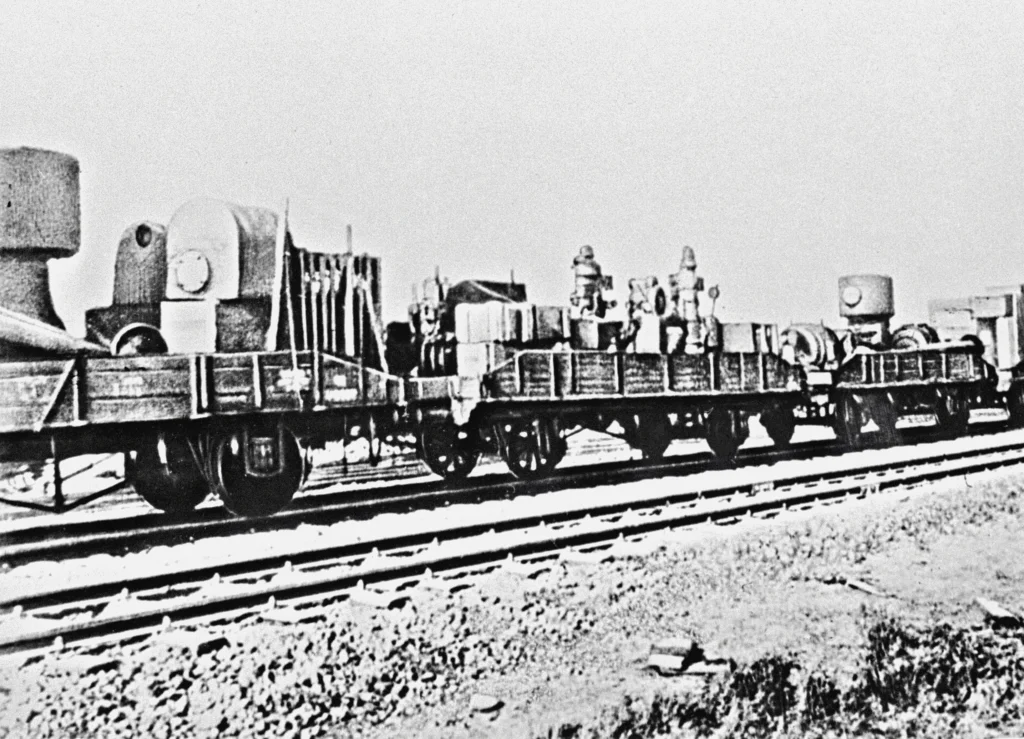 На фото: эшелон с оборудованием оружейного завода идет в эвакуацию