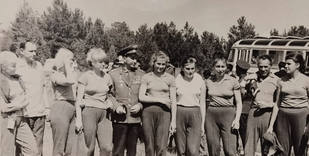 На фото: команда «Пластик» с тренером С. Беличем и один из первых космонавтов СССР П. Беляев. 1973 г.
