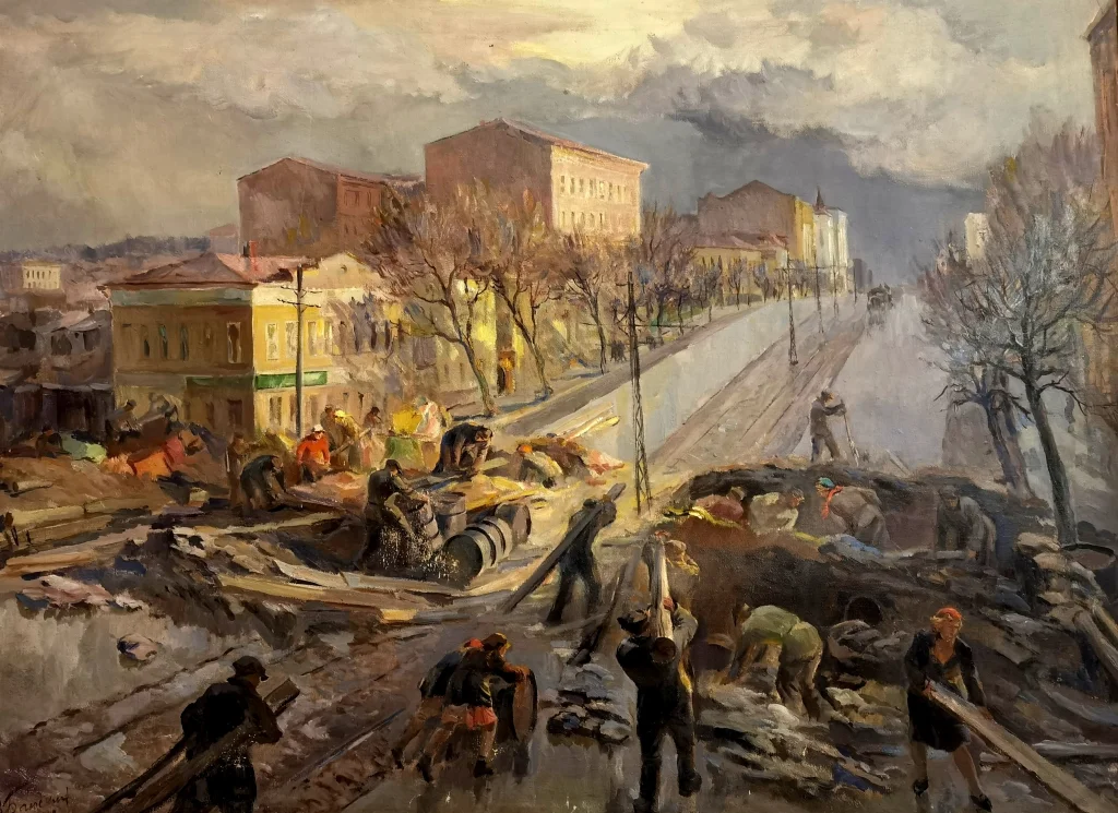 На фото: картина В. Баюскина «Население Тулы строит укрепления в городе». 1942 г. Эта картина представлена сейчас на выставке в Тульском краеведческом музее.