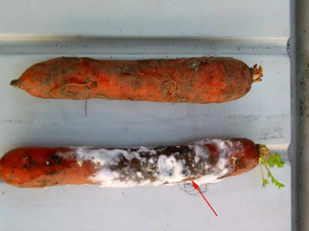 Возбудитель заболевания – гриб Sclerotinia sclerotiorum(D By) повреждает многие овощные культуры, из корнеплодов чаще всего морковь. При поражении сначала появляется рыхлый белый ватообразный налет — грибница. На их поверхности выделяются капельки жидкости. Пораженные корнеплоды размягчаются, но окрас мякоти не меняется.