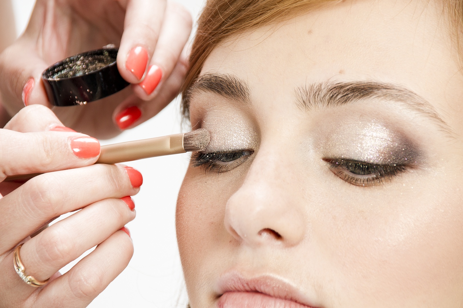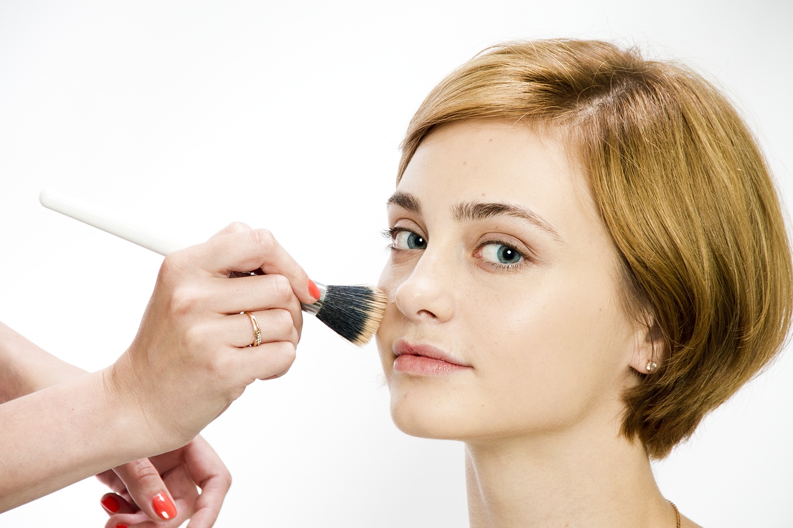 1.Наносим базу под макияж, затем — тон, максимально идентичный тону кожи. Темные круги под глазами маскируем корректором. Припудриваем лицо.
