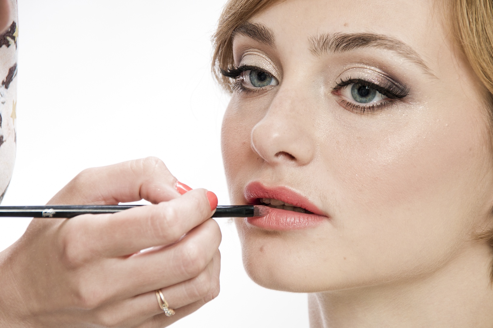 6.Контур губ прорисовываем карандашом натурального оттенка и наносим помаду теплого розового оттенка.