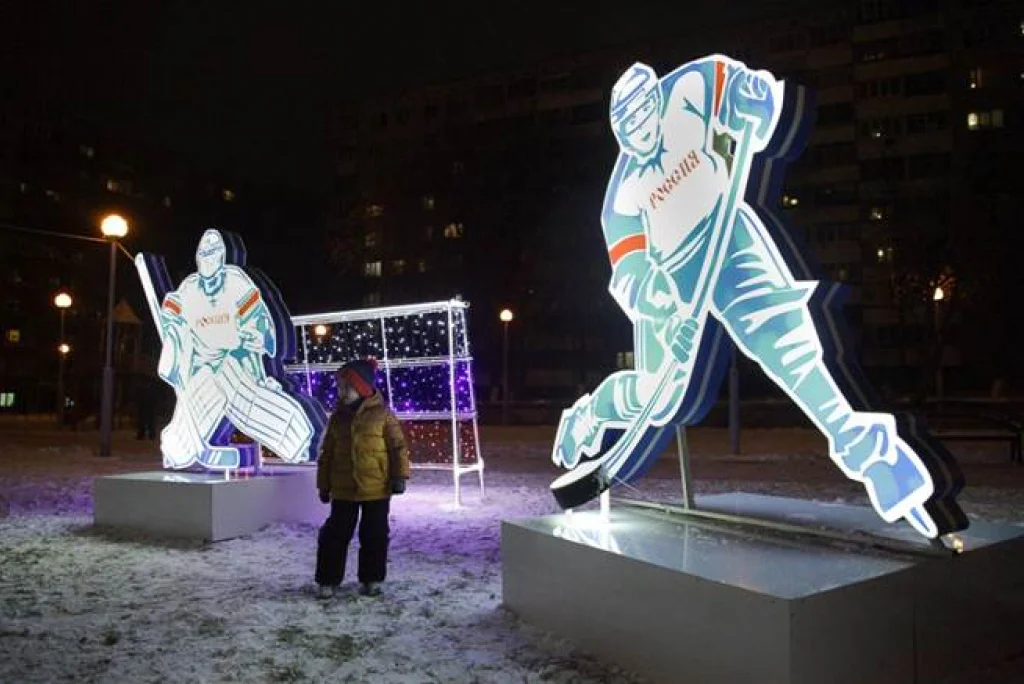 Возле музея оружия появится команда из шести хоккеистов, а также пять светящихся шаров; кустарник будет украшен сеткой.