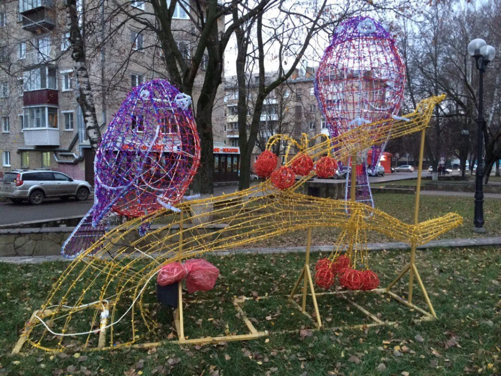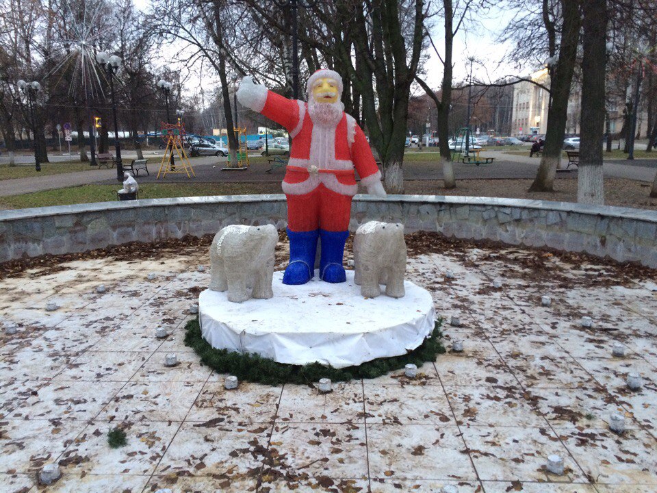 Сегодня в сквере у памятника Льву Толстому установили композицию из двух светящихся снегирей и фигурку Деда Мороза. Последний выглядит как-то не очень, вероятно потому, что стоит посреди грязного фонтана. Но жители близлежащих домов надеются, что к праздникам мусор уберут и в сквере будет сказочно красиво.