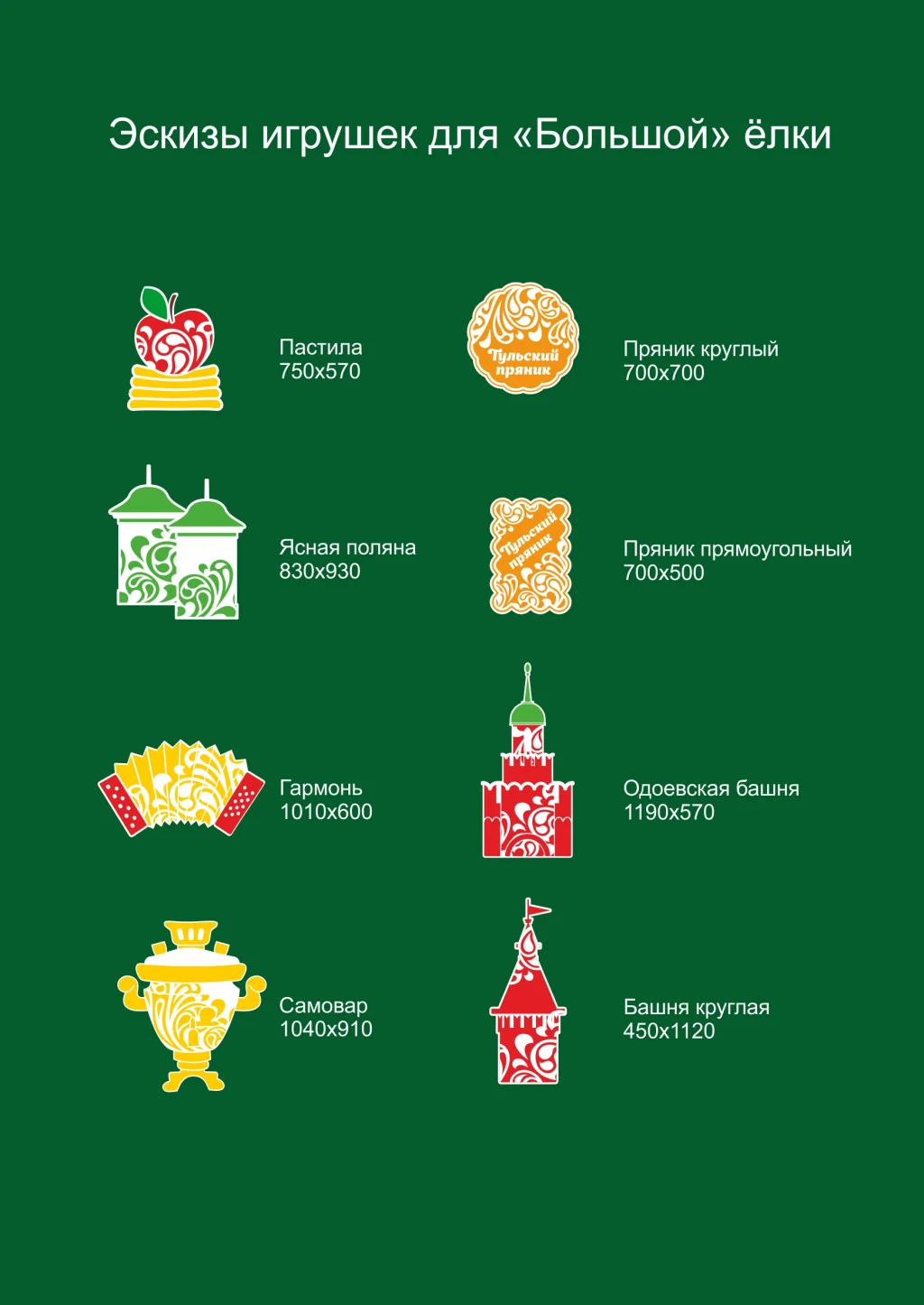 Во-первых, новогоднее дерево размесят не с краю площади, а ближе к центру. Во-вторых, для украшения елки разработан специальный «брендовый» дизайн игрушек: «пастила», «пряники», «ясная поляна», «гармонь», «одоевская башня», «самовар».