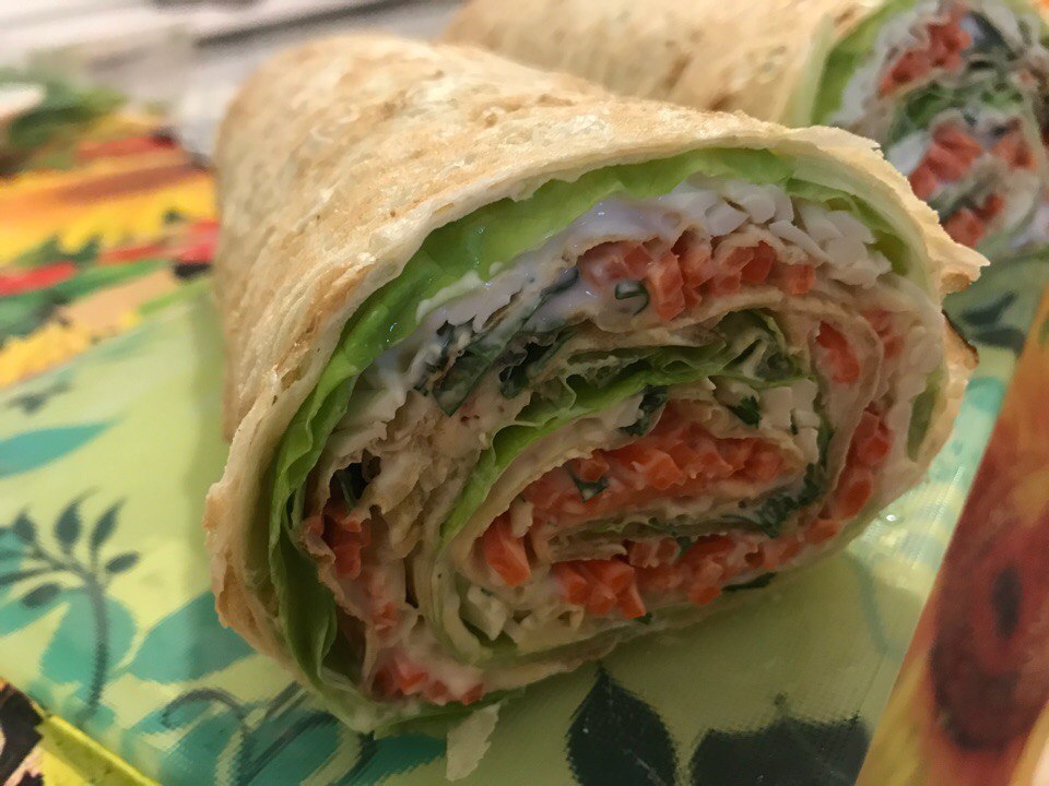 Лист лаваша, майонер, сырок тертый, листья салата. Далее снова лист лаваша, майонез, сырок, зелень. Опять лист лаваша, майонез, корейская морковь. Завернуть все в ролл , в холодильник на пол часа . Нарезаем, наслаждаемся.