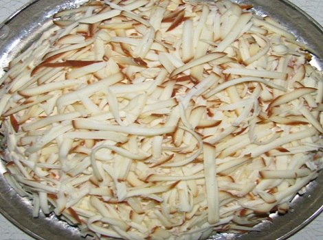 Последним слоем будет майонез. Не нужно брать майонез с большим процентом жирности, так как в духовке он не расплавиться, а будет засохшими кусочками, лучше взять майонез 20-30% жирности.