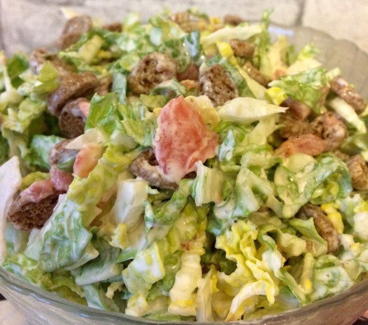 Капусту режем, высыпаем сухарики, режем рыбку и добавляем майонез, перемешиваем и кушаем.