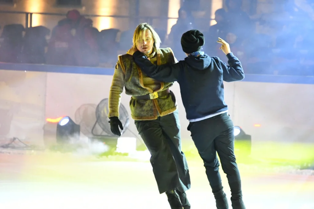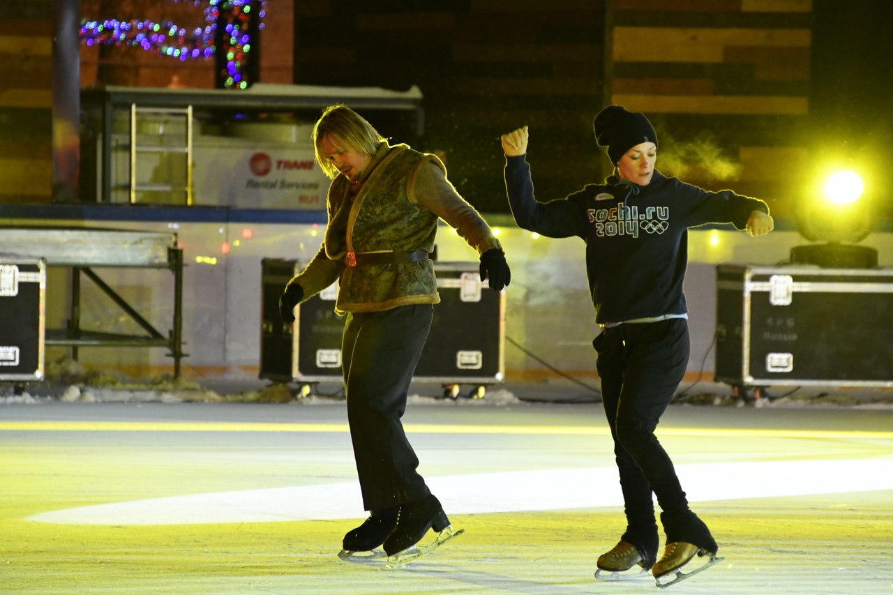 Фигуристы уже прибыли на площадь и сейчас проводят разминку.