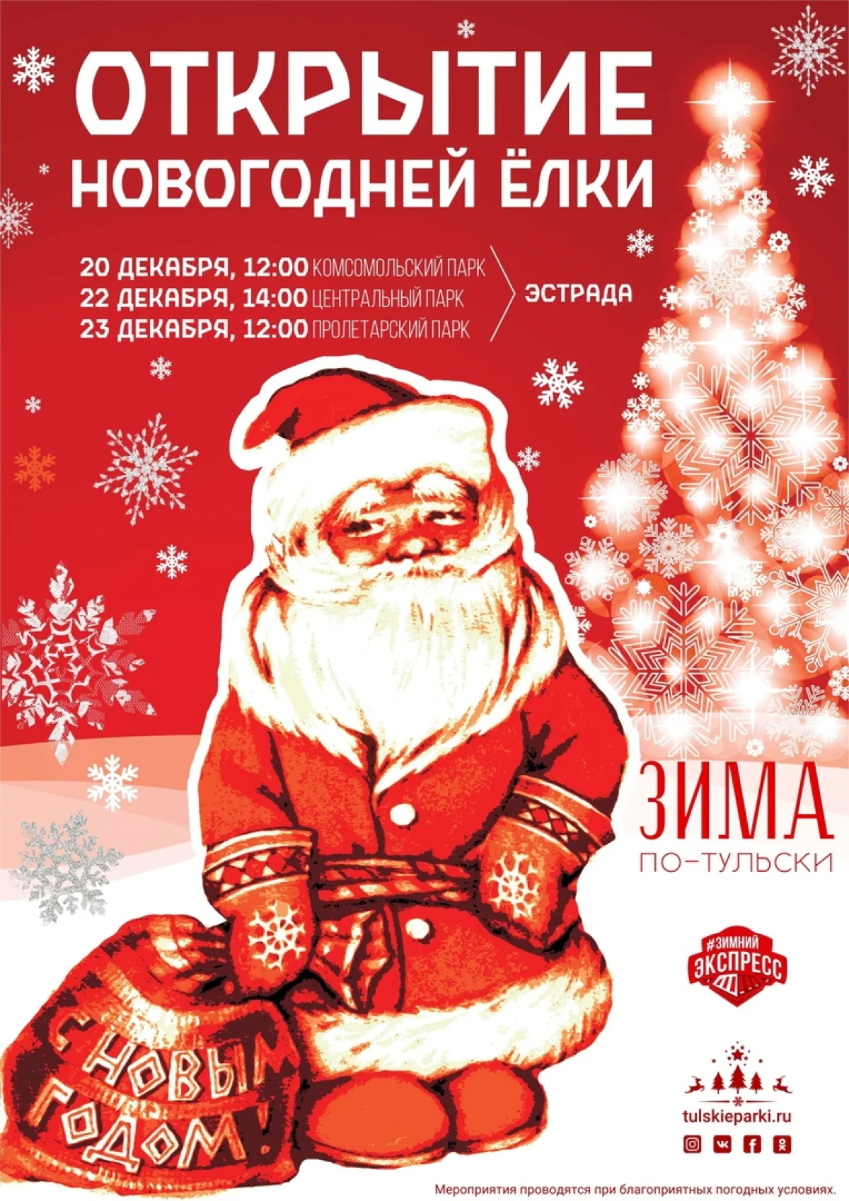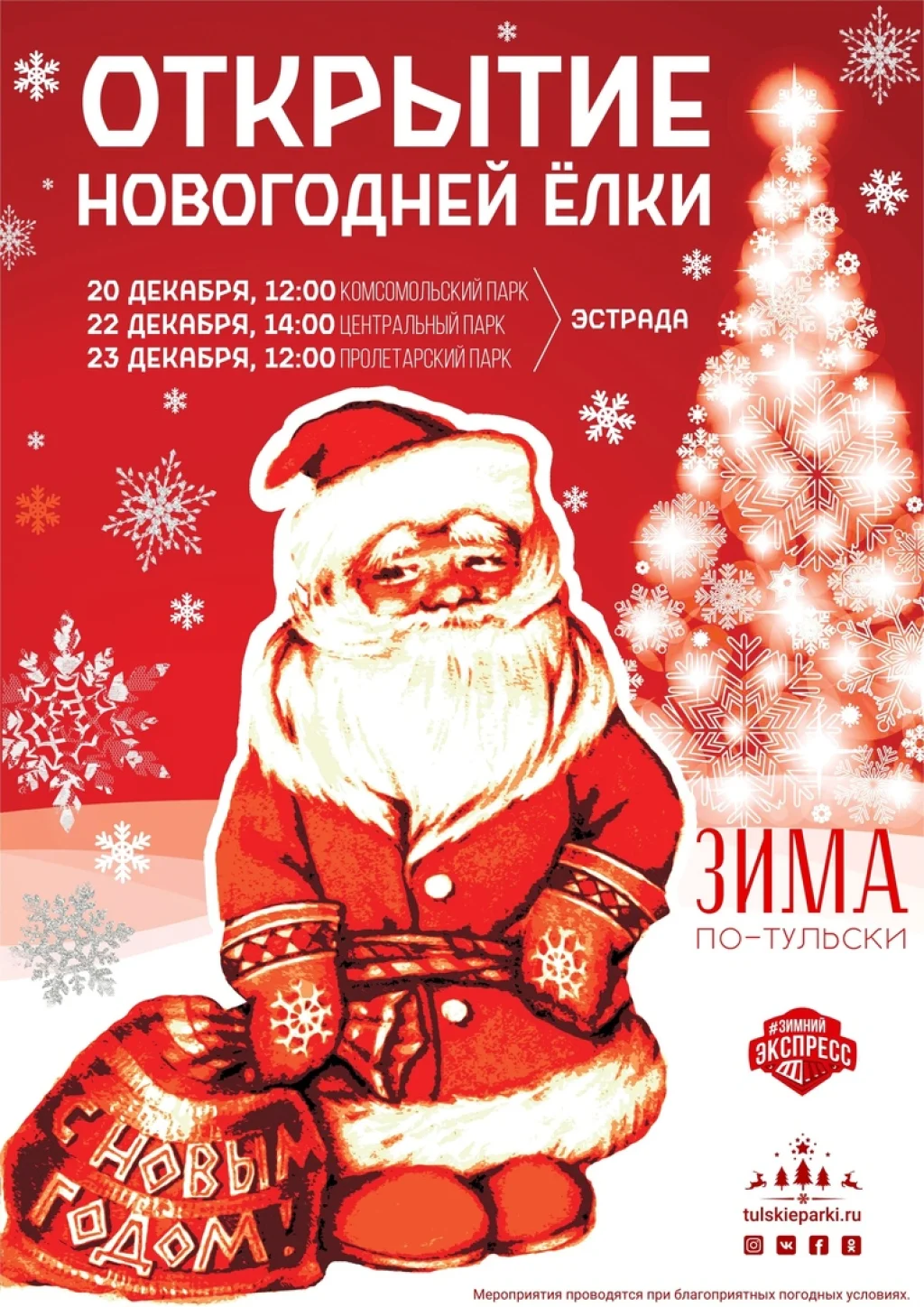 22 декабря «Зимний экспресс» проекта «Зима по-тульски» сделает остановку на станции «Праздничная» в Центральном парке. В 14.00 на фонтанной площади у эстрады начнётся открытие новогодней ёлки. Гостей ждут концертная программа, веселые игры, конкурсы и, конечно, Дед Мороз со Снегурочкой.