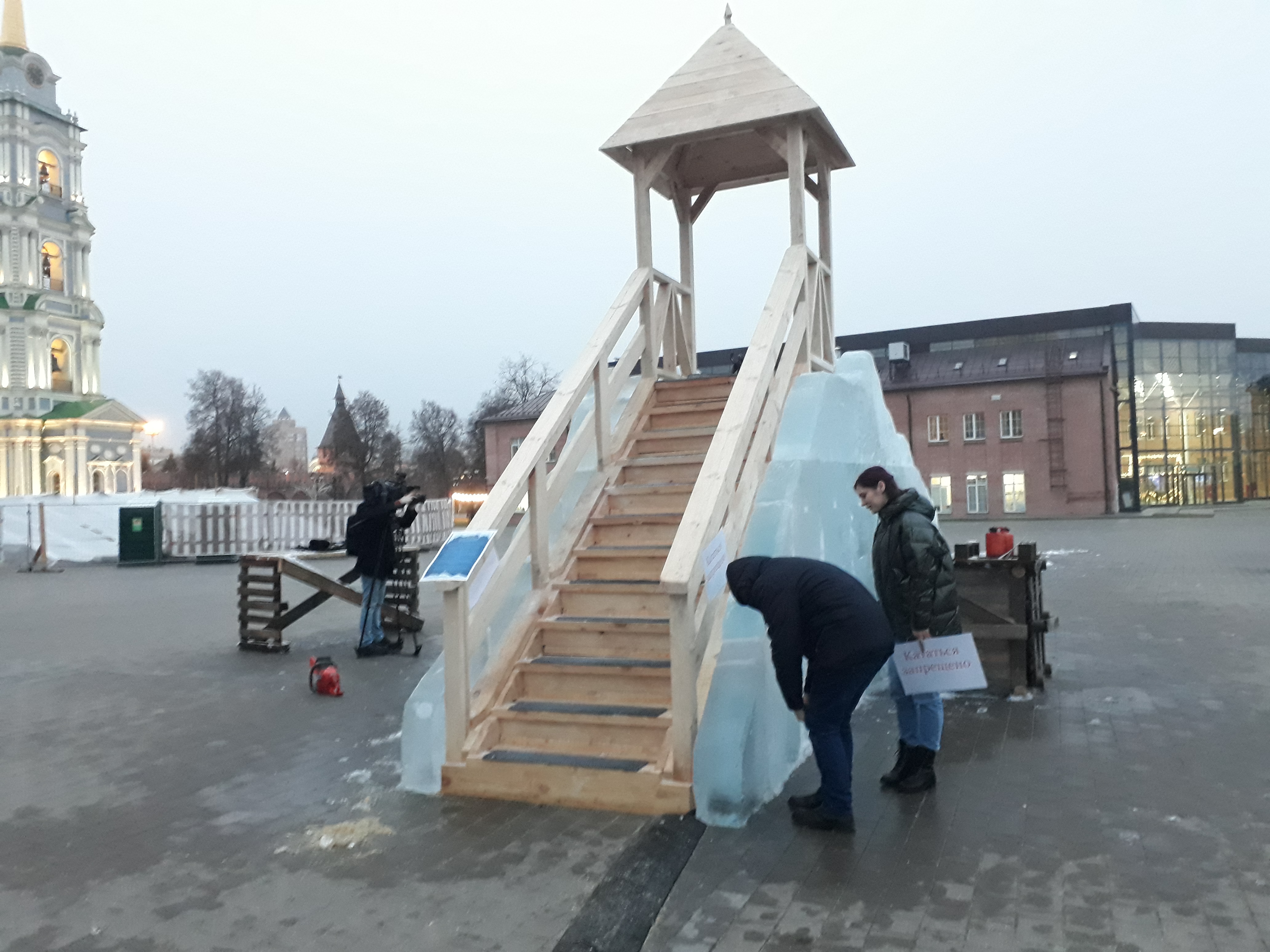 В Тульском кремле готовят к открытию ледяную горку. При ее строительстве используют лед, привезенный из озер Пермского края. В основании находится яркая подсветка, которая подчеркивает надпись "Кремлевская горка" и "500 лет кремля". Сооружение станет одним из самых больших в Туле.