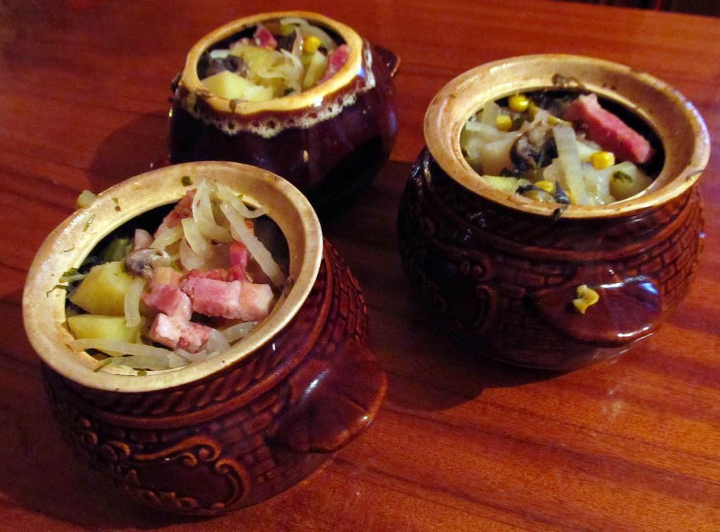 В горшочки уложить слоями: картофель, затем лук, морковь, разные сорта мяса, огурцы, консервированную кукурузу, грибы, маслины (оливки), чеснок (зубчики разрезать на 4 части вдоль). Реально необходимо все это натолкать очень плотно, ибо уваривается! До верху горшочков налить рассол от огурцов и маслин (оливок), если жидкости мало, долить воды (но нежелательно, лучше, чтобы были исключительно рассолы). Приправить солью и перцем по вкусу, и поставить в духовку примерно на час при 170-180 градусах.