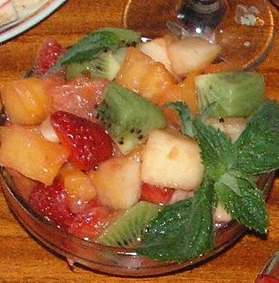 Смешиваем, слегка посыпаем сахаром и взбрызгиваем соком лимона. Можно добавить немного натурального апельсинового сока. Ставим на пару часов в холодильник. Затем салат раскладываем в отдельные стеклянные вазочки. Чтобы оттенить вкус фруктов, можно добавить немного ликера. Украшать все веточкой мяты.