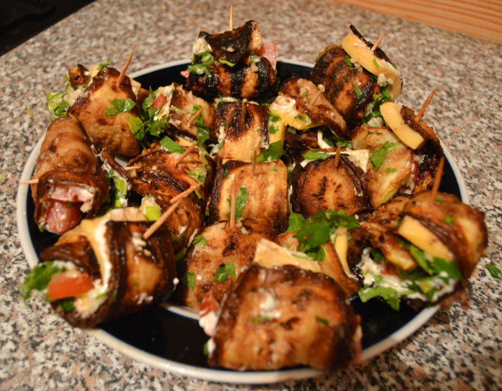 Горячие обжаренные кабачки выложить на тарелку, остудить, намазать майонезом одну сторону. С одного краю положить кусочек сыра, с другого — ломтик помидора. Затем равномерно выложить на кабачок чеснок и зелень. Свернуть кабачок рулетом, начиная с того края, где лежит помидор. Выложить на тарелку так, чтобы краешек был сверху. Заколоть кабачковый рулетик зубочисткой. Отличная и сытная холодная закуска получается!