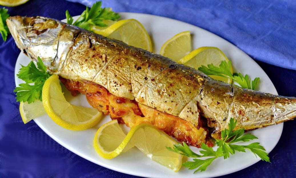 Завернутую в фольгу рыбу выкладываем на противень, наливаем немого воды и — в нагретую духовку на 30-40 минут. О готовности фаршированной скумбрии можно судить по аппетитному запаху. Если хотите получить подрумянившийся рулетик, минут за 10 до готовности разверните фольгу и оставьте допекаться в таком виде.