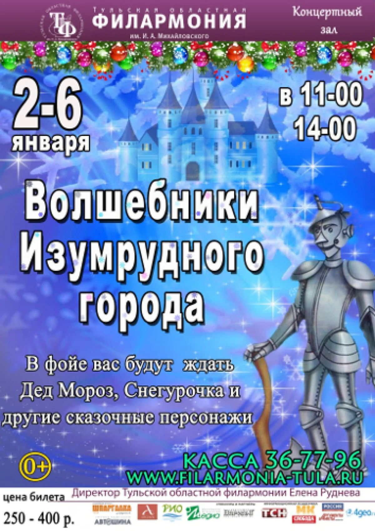 2-6 января 2016 г. в 11:00 и 14:00 в Концертном зале Тульской областной филармонии состоится новогоднее театрализованное представление для детей «Волшебники изумрудного города»