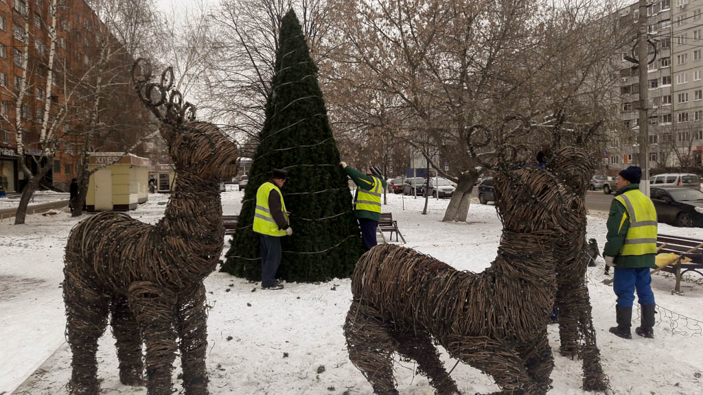 В дальнейшем и елка, и олени будет украшены новогодними гирляндами и игрушками. Вся композиция будет подключена к новогодней иллюминации.