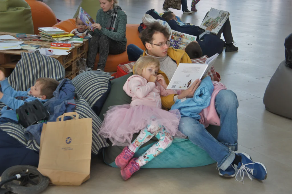 Для гостей фестиваля работала большая книжная ярмарка, на которой были представлены больше 20 детских издательств, проводились различные мастер-классы, конкурсы, квесты, творческие мастерские, лекции писателей, иллюстраторов и много другое. В отличие от прошлого года, фестиваль проходил не под открытым небом, а в атриуме, так что даже несмотря на прохладную погоду все желающие могли читать, рисовать и общаться сколько угодно.