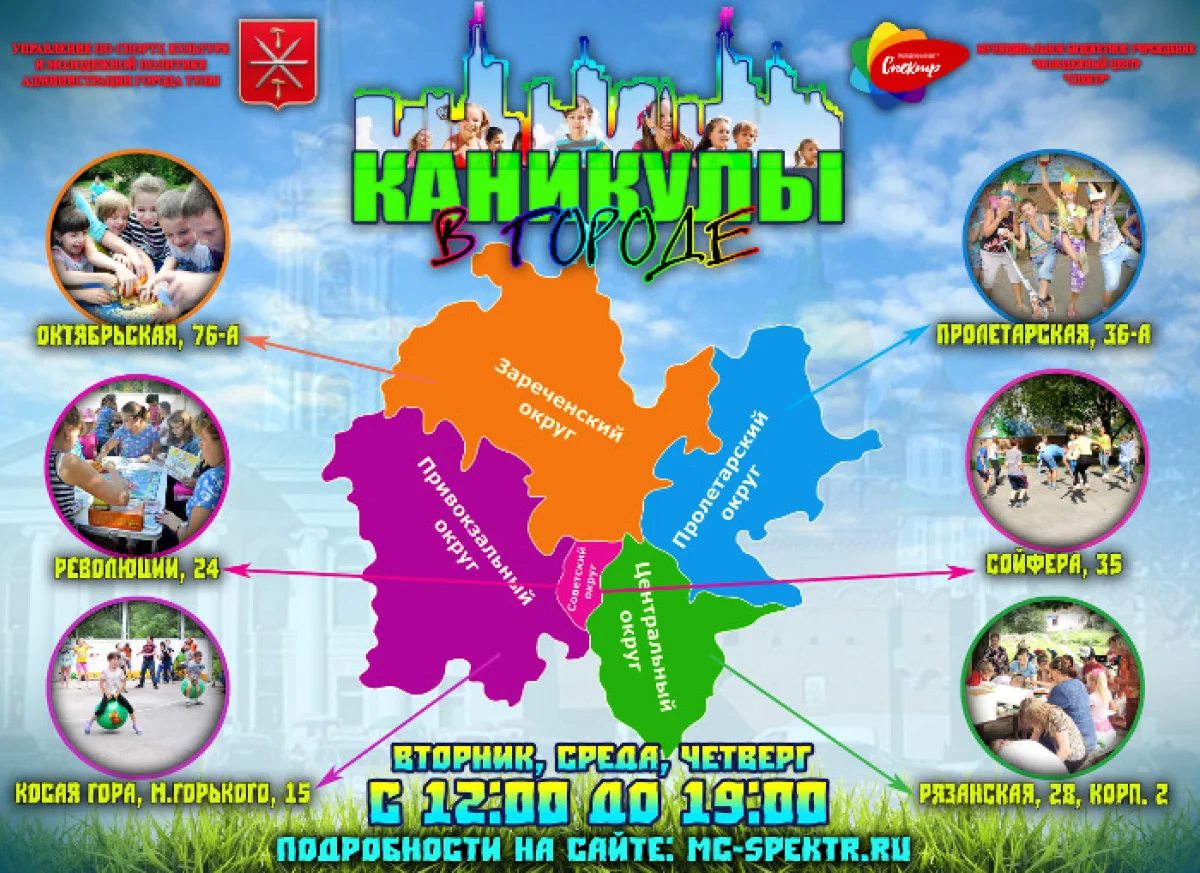 Проект «Каникулы в городе» пройдёт в нашем городе уже в третий раз. Досуговая программа для детей, которые будут проводить свои каникулы в городе, организована по поручению главы администрации города Тулы Евгения Авилова.