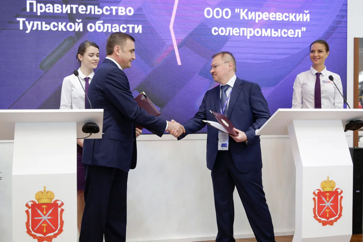 1 июня XXI Петербургского международного экономического форума Губернатор Тульской области Алексей Дюмин и председатель совета директоров ООО «Киреевский солепромысел» Артем Чайка подписали соглашение о сотрудничестве.
