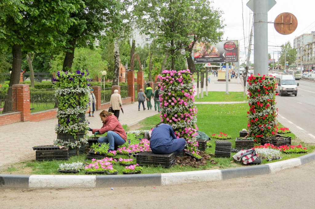 Вертикальные «клумбы» появились на ул. Октябрьской, в районе дома №74. Они представляет собой шесть колонн, составленных из петуний и цинерарий разных оттенков. В общей сложности в их изготовлении использовано 3600 цветов.