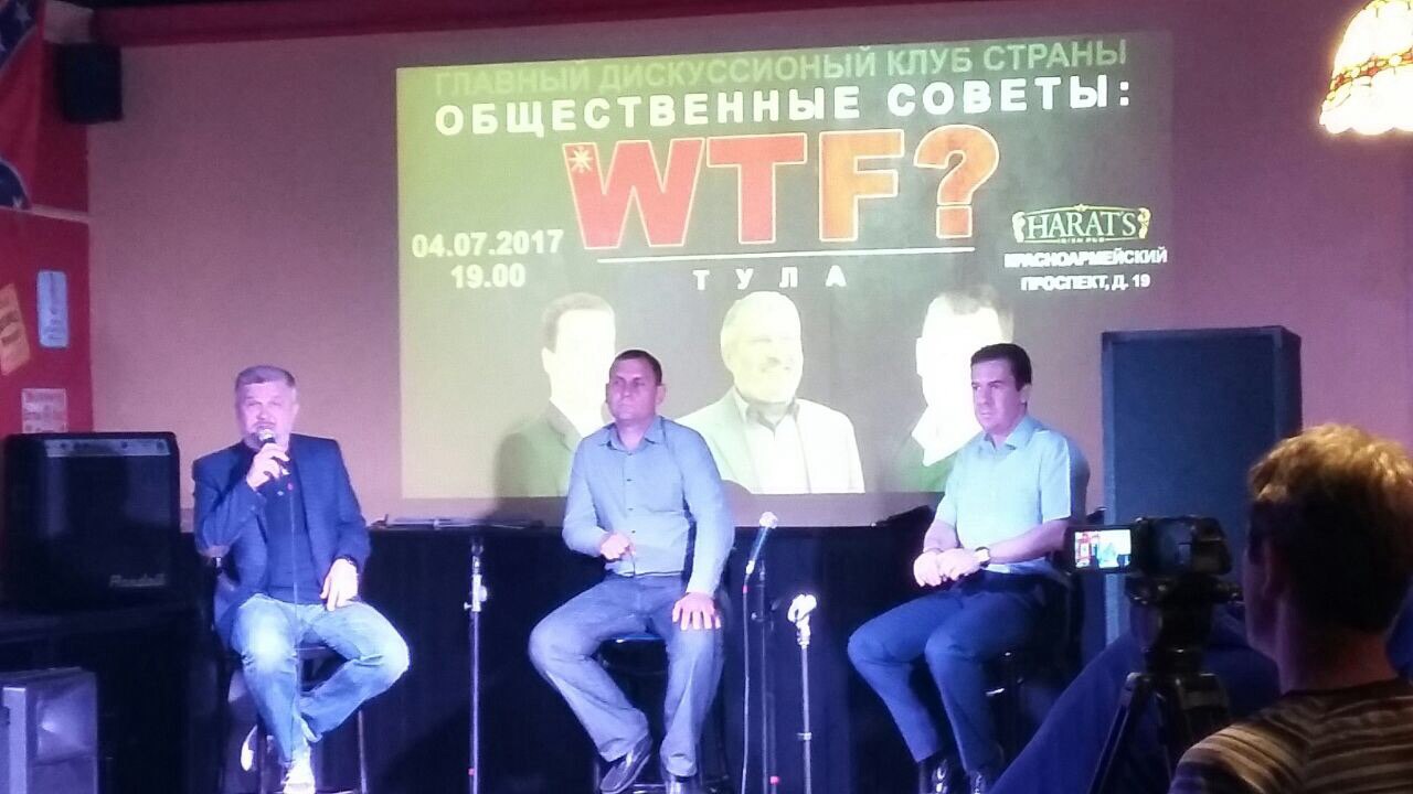 В Туле состоялось первое заседание дискуссионного клуба WTF. По заявлению организаторов, площадка представляет собой дискуссионный политический клуб, где собираются политики, политконсультанты, политтехнологи, политологи, политические журналисты и блогеры и обсуждают самые горячие вопросы политической жизни страны. Первой темой, рассмотренной в таком формате, стала перезагрузка Общественных советов при органах исполнительной власти Тульской области.