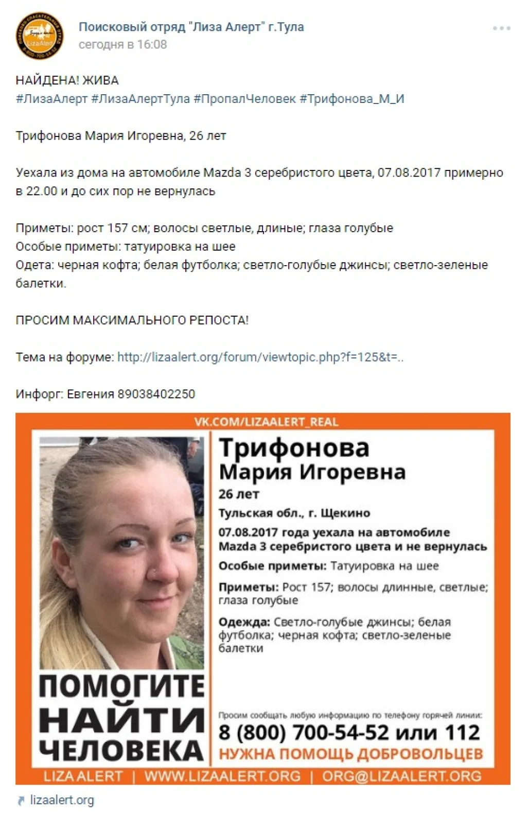 9 августа в группе поискового отряда появилась информация о том, что девушка найдена живой.